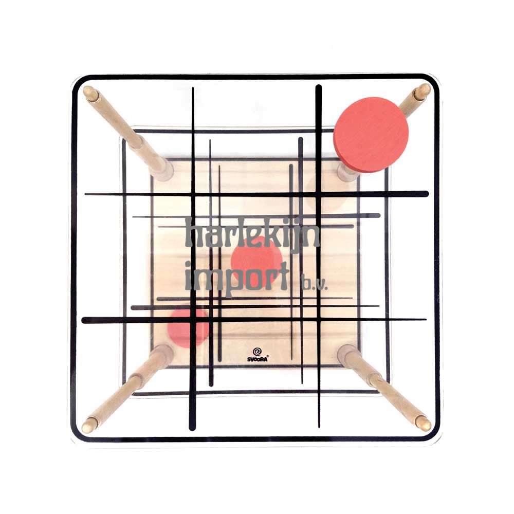 Het klassieke spel Tic Tac Toe gaat naar een andere dimensie. In feite gaat het naar het epische aantal van 3 dimensies! Je kunt in één laag spelen, zoals je gewend was, of het naar een ander niveau brengen en de uitdaging uitbreiden naar 3 lagen! Zet er 3 op een rij, horizontaal, verticaal en diagonaal rondom het rooster! Het bevat: 1 houten basis, 13 rode 'O' en 13 blauwe 'X' pionnen, 2 acrylborden, 4 houten staven.