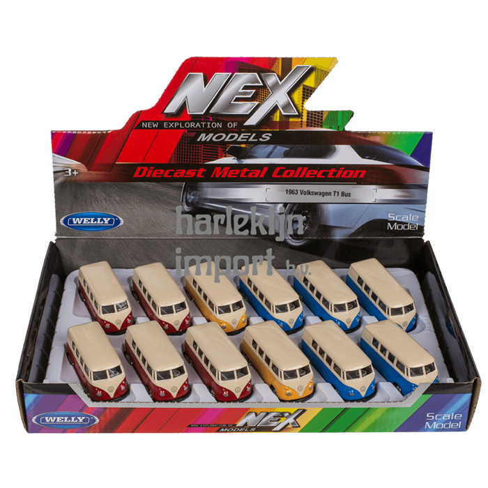 Dsp Modelauto VW T1 bus 1963. 4 assortie kleuren metaal met plastic. ca. 7,5 cm. 12 stuks in display. |