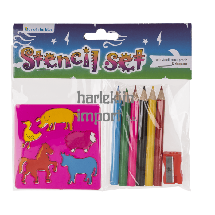 Dsp Schoolset, 3 stuks. Sjabloon 4 verschillende, kleurpotloden & puntenslijper. 24 stuks in display.