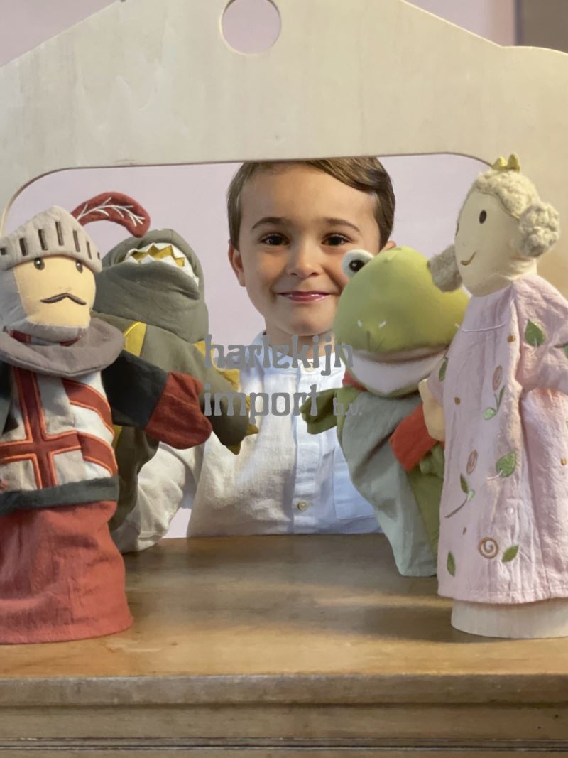 Steek je hand in de katoenen handpop en doe zijn mond bewegen op het ritme van het verhaal.