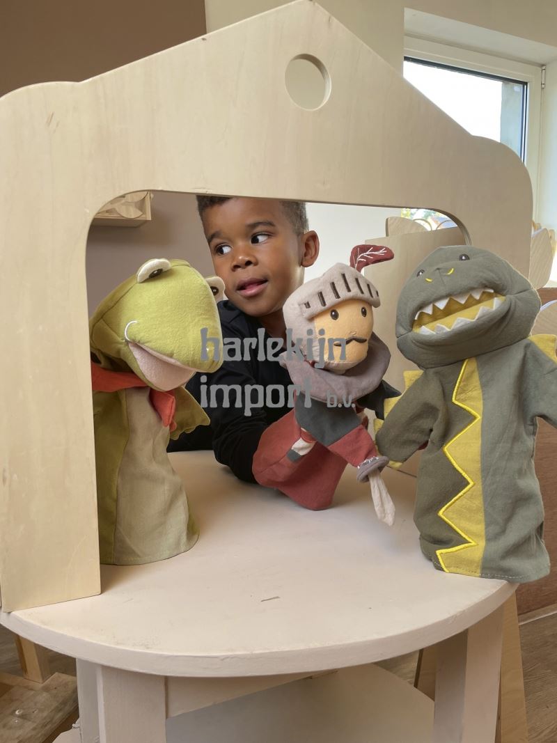Steek je hand in de katoenen handpop en doe zijn mond bewegen op het ritme van het verhaal.