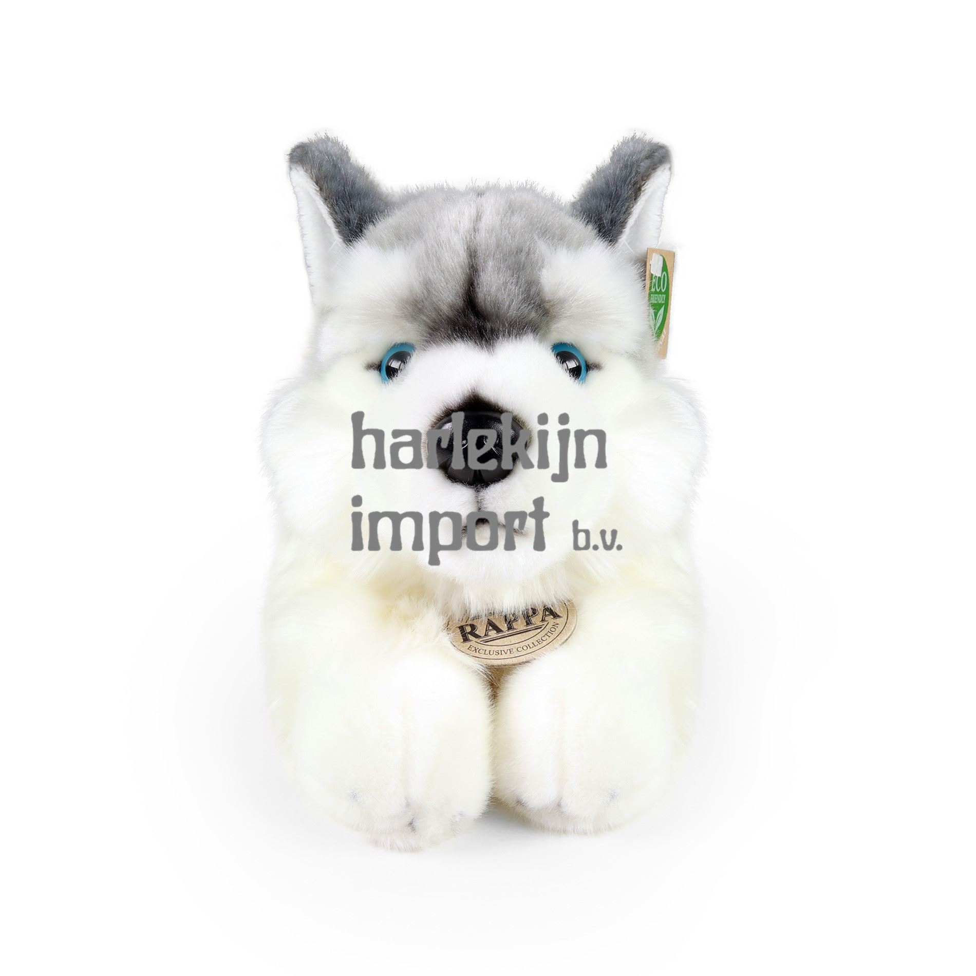 Schattige pluche hond Husky mag in geen enkele kinderkamer ontbreken! Deze liggende hond is gemaakt van exclusief, hoogwaardig pluche en heeft een lengte van ongeveer 30 cm. Dit sensationele pluche stuk is ook ideaal als cadeau! Wat betekent ECO-FRIENDLY eigenlijk? De vulling van de knuffel is gemaakt van gerecyclede PET-flessen. Dit materiaal is volkomen veilig, niet te onderscheiden van de standaard vulling en volledig gecertificeerd voor de veiligheid van zelfs de allerkleinsten. We hebben besloten om de groene weg zo milieuvriendelijk mogelijk te gaan - de ECO-VRIENDELIJKE manier.