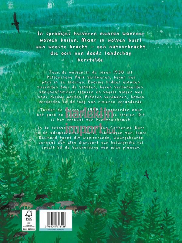 In sprookjes huiveren mensen wanneer wolven huilen. Maar in wolven huist een woeste kracht – een natuurkracht die ooit een doods landschap herstelde. Toen de wolven in de jaren dertig uit Yellowstone Park verdwenen, begon het park in te storten. Enorme kuddes elanden zwermden over de vlakten, beren verhongerden, konijnenfamilies slonken en vogels vlogen weg naar nieuwe oorden. Planten verdwenen, bomen verdorden en de loop van rivieren veranderde. Totdat de wolven in 1995 terugkeerden naar het park en alles weer begon op te bloeien. Dit is het verhaal van hun thuiskomst. In de betoverende woorden van Catherine Barr en de adembenemend mooie tekeningen van Jenni Desmond, die we kennen van bijvoorbeeld De blauwe vinvis en De ijsbeer, toont dit inspirerende, waargebeurde verhaal dat elke diersoort een belangrijke rol speelt bij de bescherming van onze planeet. Een waargebeurd verhaal over een wildernis die weer tot leven komt
