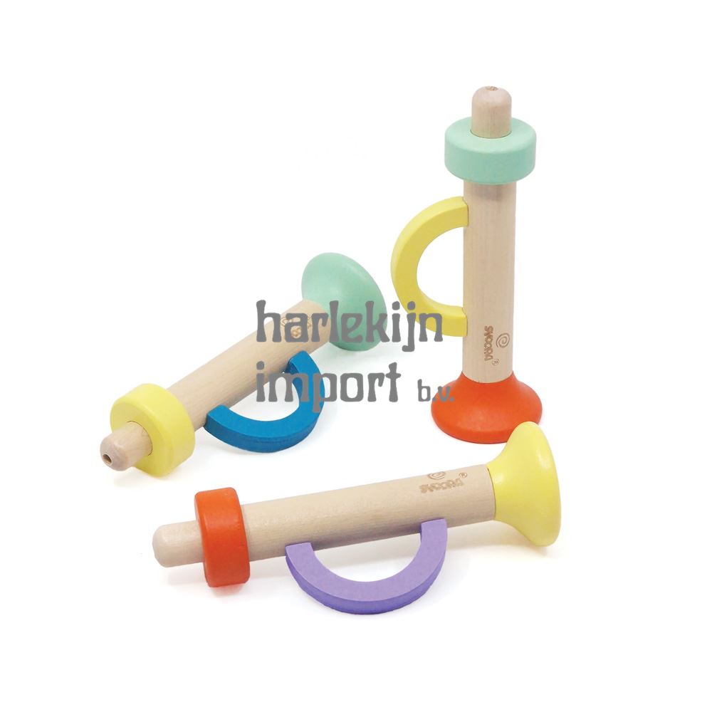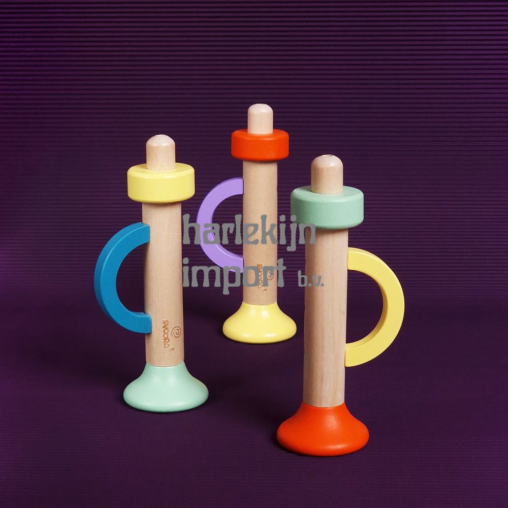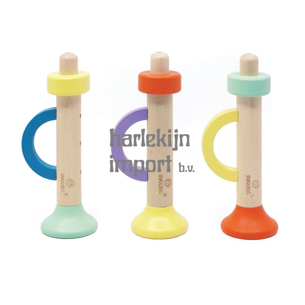 Dsp. Houten Trompet, mellow melodies. 4,3x5,9x14 cm. 3 verschillende kleuren. 9 stuks in display. |