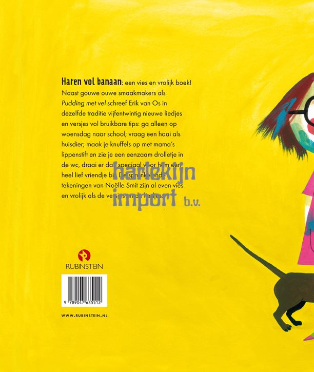 Haren vol banaan: een vies en vrolijk boek! Naast gouwe ouwe smaakmakers als Pudding met vel schreef Erik van Os in dezelfde traditie vijfentwintig nieuwe liedjes en versjes vol bruikbare tips: ga alleen op woensdag naar school; vraag een haai als huisdier; maak je knuffels op met mama’s lippenstift en zie je een eenzaam drolletje in de wc, draai er dan speciaal voor hem een heel lief vriendje bij. De sprankelende tekeningen van Noëlle Smit zijn al even vies en vrolijk als de versjes en de liedjes.