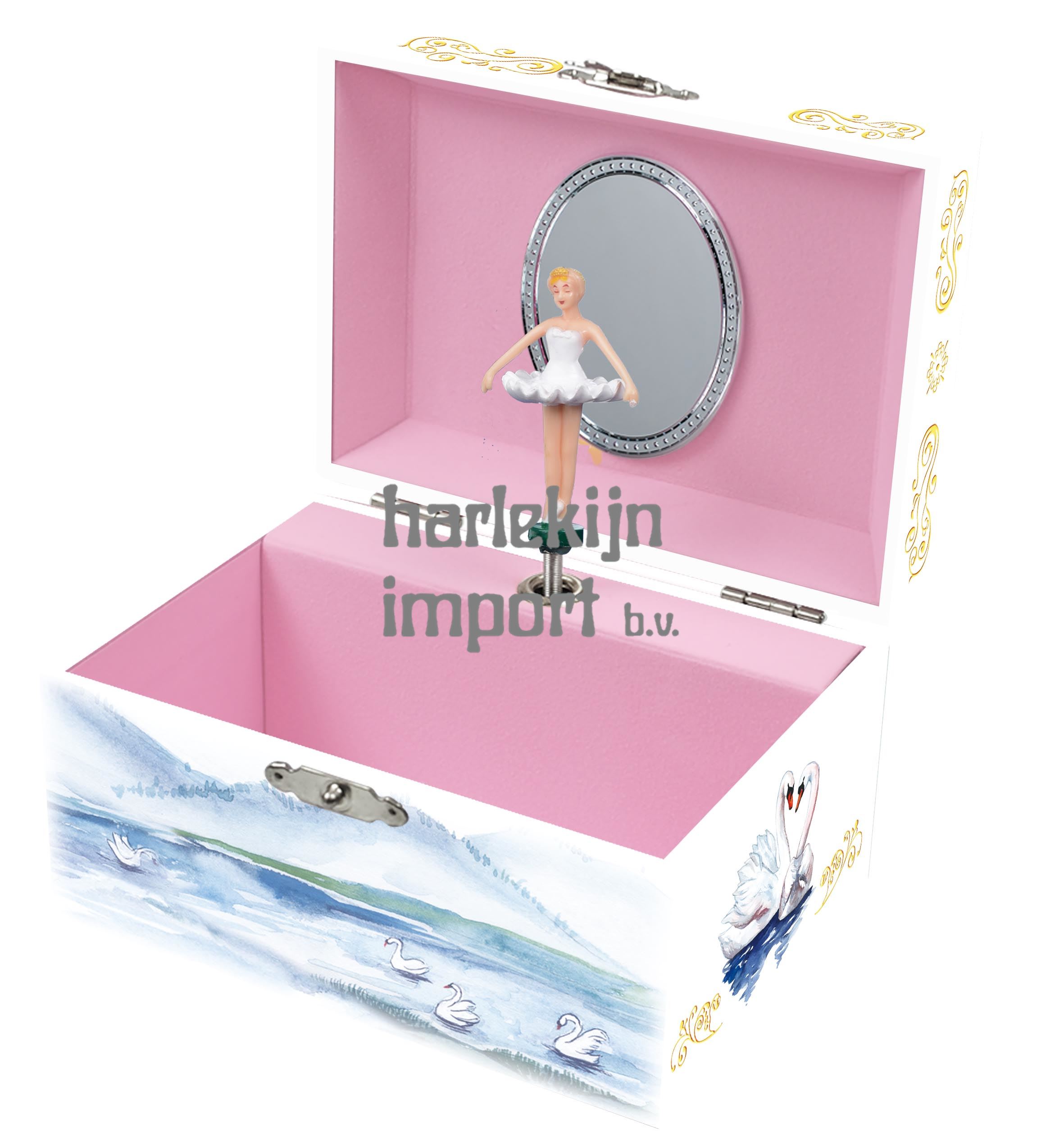 Juwelendoos - muziekdoos: Ballerina met zwanen. Figuur in doosje: Ballerina wit. Melodie: Swane lake. 3+ |