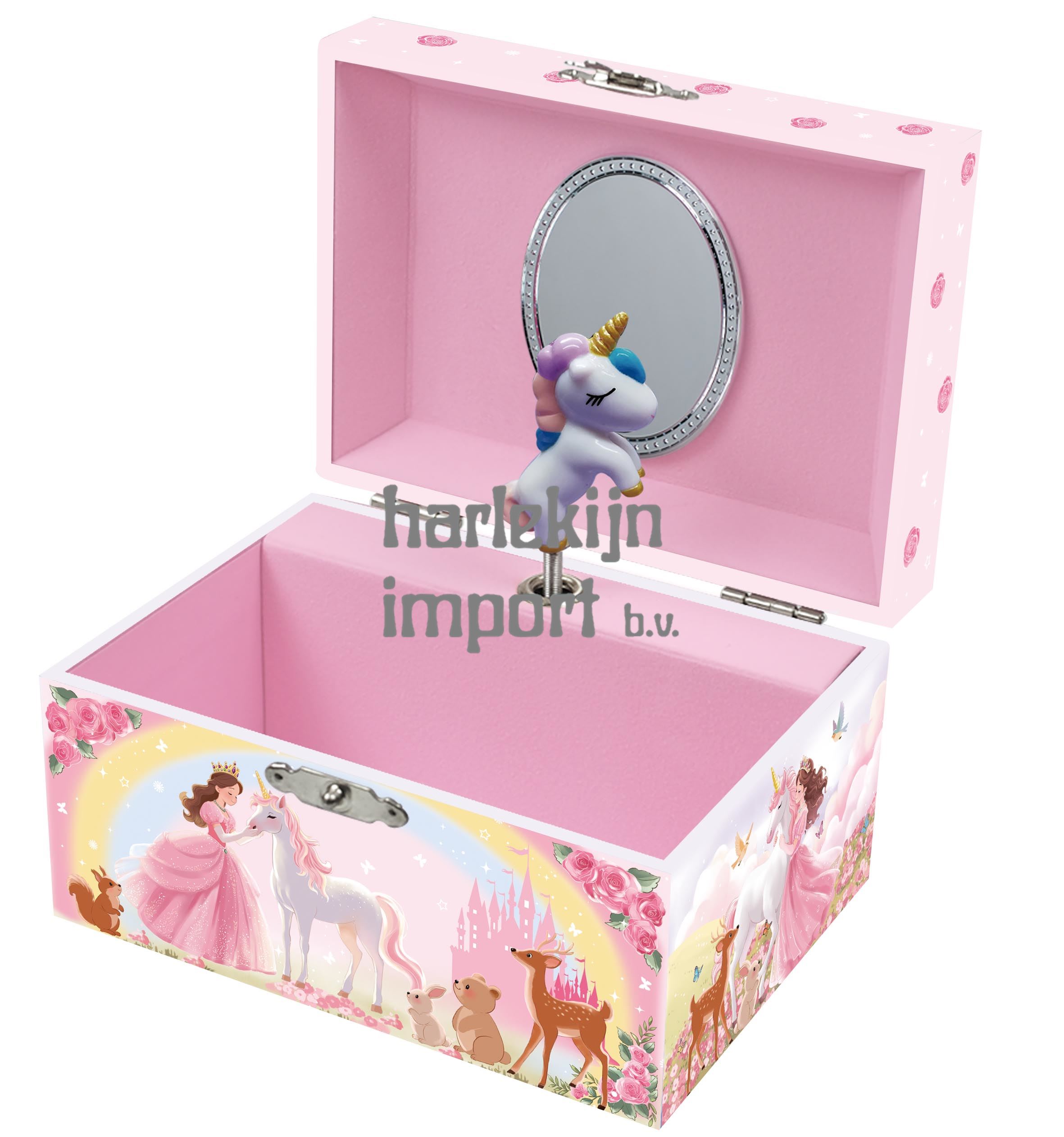 Juwelendoosje met muziek. Print: Eenhoorn met prinses.