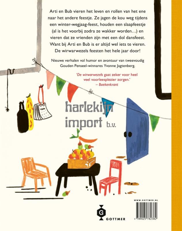 Een nieuw voorleesboek van Yvonne Jagtenberg over de beste vrienden Arti en Bub, oftewel: de wirwarwezels! De wirwarwezels zijn altijd wel in voor een feestje. Het hele jaar door vieren Arti en Bub het leven en rollen ze van het ene naar het andere feestje. Ze planten bomen op Boomplantdag, houden een slaapfeestje (al is het alweer voorbij zodra ze wakker worden) en organiseren een verkleedfeest. En er staan nog talloze andere bekende en bijzonder verrassende feestjes in dit leuke voorleesboek. Want bij Arti en Bub valt er altijd wel iets te vieren! Na het succes van 'De wirwarwezels' en 'De wirwarwezels op weg!', waarin we de vriendschap, humor en conflicten van Arti en Bub leerden kennen, neemt dubbel Gouden Penseel-winnares Yvonne Jagtenberg ons mee op een nieuw avontuur. 'De wirwarwezels feesten!' is een heerlijk eigenzinnig en supergrappig kinderboek, een boek zoals alleen Yvonne Jagtenberg dat kan maken. Met haar gevoel voor humor en haar rake illustraties slaagt Jagtenberg erin complexe thema's op een toegankelijke manier aan te snijden. De boeken van de wirwarwezels zijn zonder twijfel de leukste voorleesboeken voor kinderen vanaf 5 jaar.
