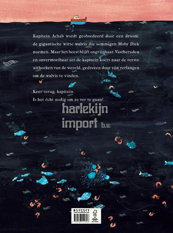 Kapitein Achab is vastbesloten om Moby Dick, de legendarische witte walvis, op te sporen. Gedreven door een onstuitbare obsessie volgt hij zijn aartsvijand door woeste zeeën en ondoordringbare mist. Hij trotseert een kerkhof van scheepswrakken, navigeert door een zee vol kwallen en breekt door dikke wolkenbanken. Onderweg ontdekt hij een wereld vol wonderen: mystieke ijsbergen, plotseling opduikende eilanden en donkere grotten bewoond door mysterieuze figuren. Maar nergens is er een spoor van Moby Dick. Achab moet erkennen: de zee blijft een ondoorgrondelijk mysterie. In dit prachtige prentenboek heeft Manuel Marsol, de maker van 'De berg', het meesterwerk Moby Dick van Herman Melville opnieuw tot leven gebracht.