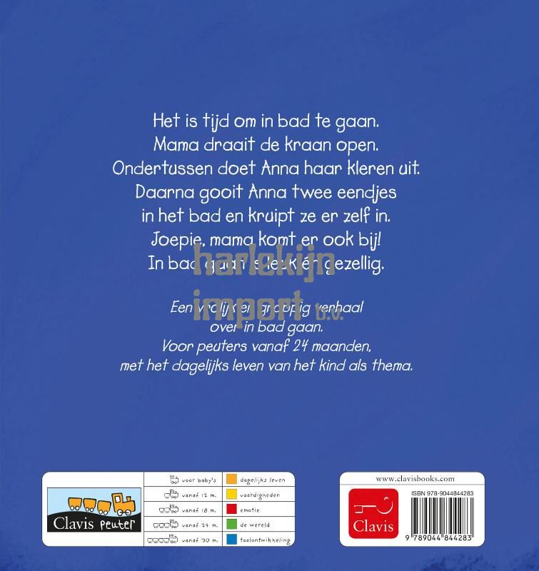 Een vrolijk en grappig verhaal over in bad gaan. Voor peuters vanaf 24 maanden, met het dagelijks leven van het kind als thema. Het is tijd om in bad te gaan. Mama draait de kraan open. Ondertussen doet Anna haar kleren uit. Daarna gooit Anna twee eendjes in het bad en kruipt ze er zelf in. Joepie, mama komt er ook bij! In bad gaan is leuk én gezellig.