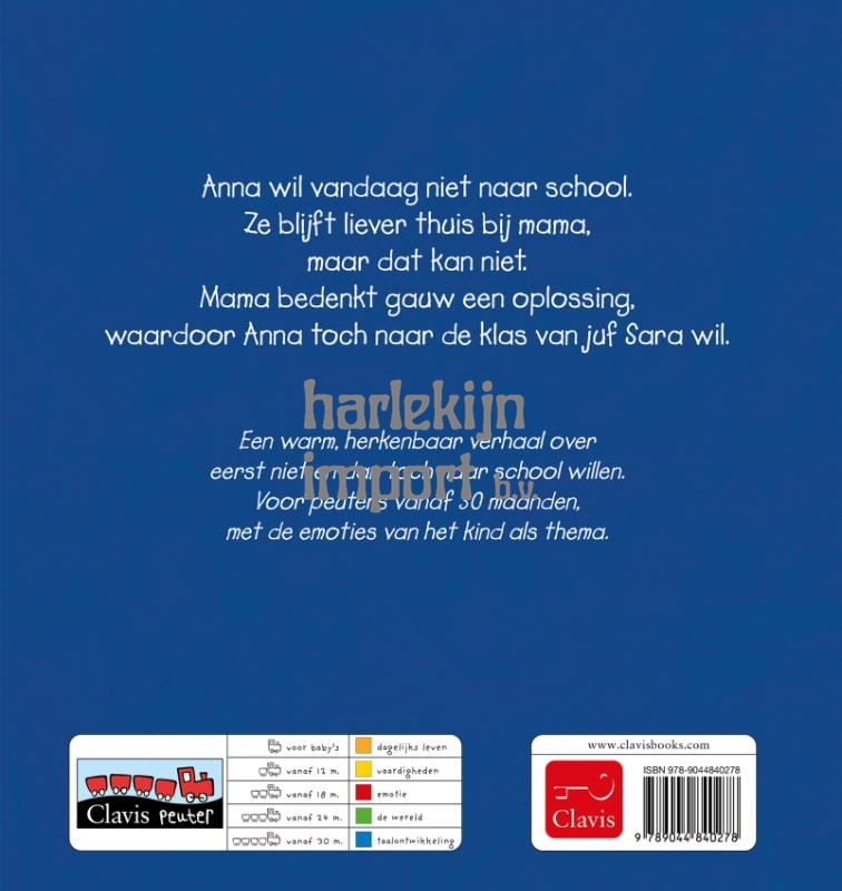 Een warm, herkenbaar verhaal over eerst niet en dan toch naar school willen. Voor peuters vanaf 30 maanden, met de emoties van het kind als thema. Anna wil vandaag niet naar school. Ze blijft liever thuis bij mama, maar dat kan niet. Mama bedenkt gauw een oplossing, waardoor Anna toch naar de klas van juf Sara wil.