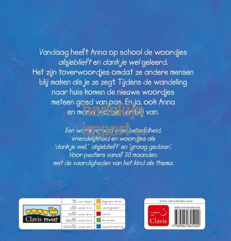 Vandaag heeft Anna op school de woordjes alsjeblieft en dank je wel geleerd. Het zijn toverwoordjes omdat ze andere mensen blij maken als je ze zegt. Tijdens de wandeling naar huis komen de nieuwe woordjes meteen goed van pas. En ja, ook Anna en mama worden er blij van. Een warm verhaal over beleefdheid, vriendelijkheid en woordjes als ‘dank je wel,’ ‘alsjeblieft’ en ‘graag gedaan’. Voor peuters vanaf 30 maanden, met de vaardigheden van het kind als thema.