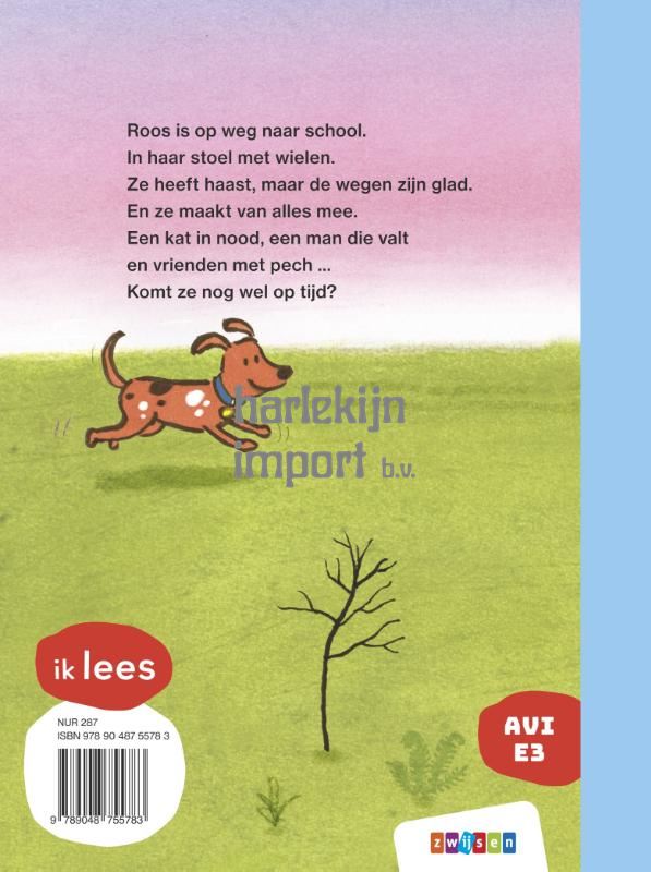 Roos is op weg naar school. In haar stoel met wielen. Ze heeft haast. Maar de wegen zijn glad. En ze maakt van alles mee. Een kat in nood, een man die valt en vrienden met pech … Komt ze nog wel op tijd? Roos doet haar best om op tijd op school te komen in haar stoel met wielen. Buiten is het koud en glad. Onderweg komt ze steeds mensen tegen die haar hulp goed kunnen gebruiken. Een kat in nood, een man die uitglijdt, vrienden met pech … Roos schiet te hulp! Kan ze iedereen helpen en ook nog op tijd op school komen? Dit vrolijke en herkenbare verhaal uit de serie ik lees voor beginnende lezers zit vol verrassende wendingen! Dat is met plezier leeskilometers maken!