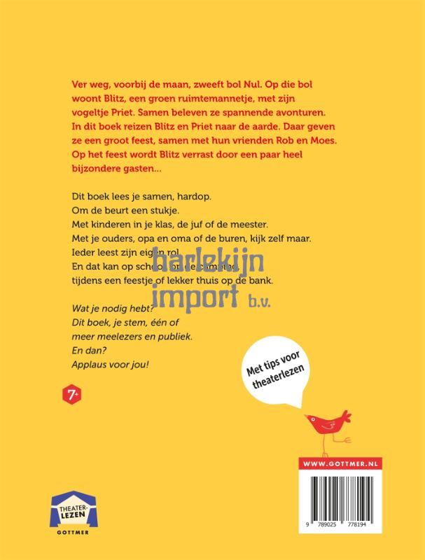 Een heerlijk origineel Blitz-verhaal in de Theaterlezen-reeks voor lezers vanaf 7 jaar! In dit Theaterleesboek over ieders favoriete ruimtewezen reizen Blitz en zijn vogeltje Priet naar de aarde. Daar gaan ze een groot feest organiseren, samen met hun vrienden Rob en Moes. Op het feest wordt Blitz verrast door een paar heel bijzondere gasten... Rian Visser weet als geen ander hoe je een goed verhaal voor beginnende lezers schrijft, en ook voor Theaterlezen draait ze haar hand niet om. Zoals het de beroemde reeks voor beginnende lezers betaamt zijn de hoofdstukken in dialoogvorm, met elk een introductie en een overzichtje van de rollen. Samen vormen ze een doorlopend verhaal dat wordt afgewisseld met grappige moppen. Leuk voor in de klas, maar zeker ook voor alle Blitz-fans thuis! Lees ook de rest van de Blitz!-serie. De AVI-boeken over Blitz van Rian Visser met illustraties van Lars Deltrap zijn mateloos populair bij beginnende lezers en is gezet in een lettertype dat gemakkelijk leest voor lezers met dyslexie. Zo kan iedereen zelf lezen over de wereld vol raketten, ruimtewezens en ufo's.