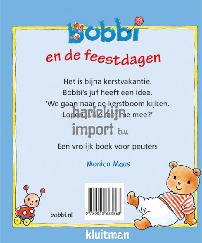 In dit boek beleeft Bobbi de spannende en feestelijke maand december. De kerstvakantie en feestdagen spelen een rol, maar ook de gezelligheid, de kou, de lichtjes overal op straat en als afsluiter oud en nieuw. Het is weer een warm, lief en herkenbaar boek op rijm voor peuters en kleuters. ‘Wat een supergrote kerstboom!’ Die staat midden op het plein. Bobbi roept: ‘Dat zijn veel lichtjes. Zouden het er duizend zijn?’