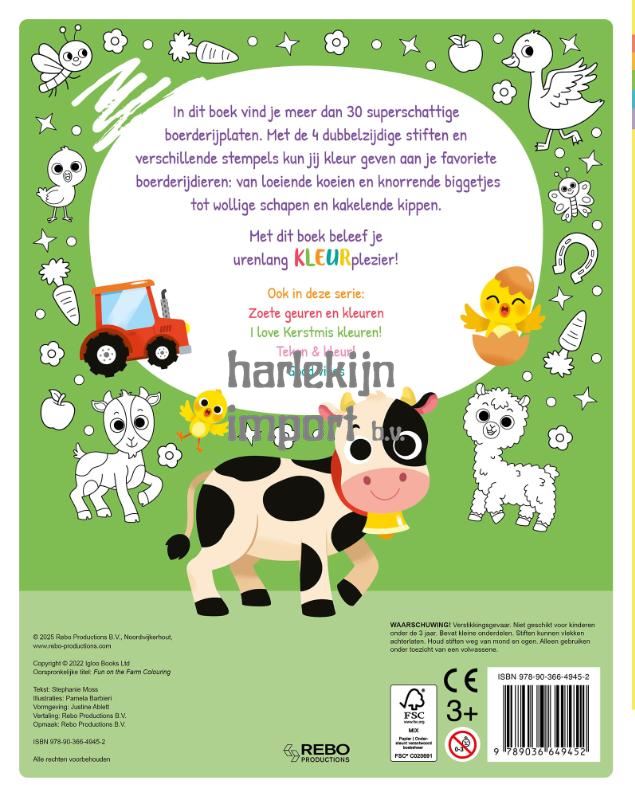 In dit boek vind je meer dan 30 superschattige boerderijplaten. Met de 4 dubbelzijdige stiften en verschillende stempels kun jij kleur geven aan je favoriete boerderijdieren: van loeiende koeien en knorrende biggetjes tot wollige schapen en kakelende kippen. Met dit boek beleef je urenlang kleurplezier!
