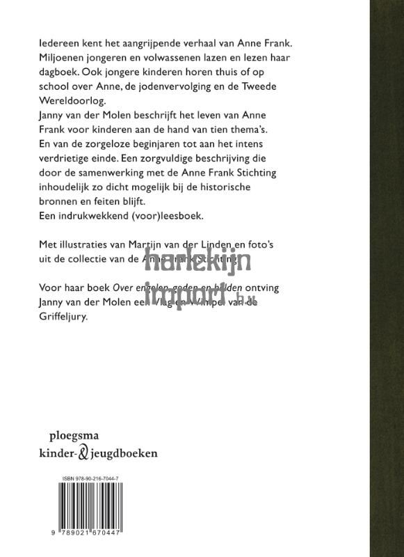 Uitgeverij Ploegsma vatte daarom het plan op om speciaal voor kinderen vanaf acht jaar een boek te maken. Het doel: een zorgvuldige en liefdevolle beschrijving van Annes leven die inhoudelijk zo dicht mogelijk bij de historische bronnen en feiten blijft. Janny van der Molen aanvaardde die uitdaging. Zij dook in de archieven, bezocht de woning van de familie Frank aan het Merwedeplein en het Achterhuis aan de Prinsengracht, reisde naar Westerbork, Auschwitz en Bergen-Belsen, en schreef een indrukwekkend (voor)leesboek.
