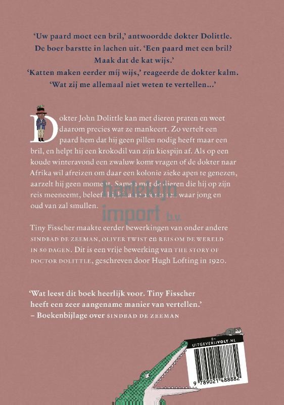 Een dokter die met dieren kan praten, hoe fantastisch is dát?Dokter John Dolittle kan met dieren praten en weet daarom precies wat ze mankeert. Zo vertelt een paard hem dat hij geen pillen nodig heeft maar een bril, en helpt hij een krokodil van zijn kiespijn af. Als op een koude winteravond een zwaluw komt vragen of de dokter naar Afrika wil afreizen om daar een kolonie zieke apen te genezen, aarzelt hij geen moment. Samen met de dieren die hij op zijn reis meeneemt, beleeft hij bizarre avonturen waar jong en oud van zal smullen.Zoals Tiny Fisscher eerder met veel succes bewerkingen maakte van Sindbad de Zeeman, Oliver Twist en een Reis om de wereld in 80 dagen, is dit een vrije bewerking van The story of Doctor Dolittle, geschreven door Hugh Lofting in 1920. ‘In tijden van afnemende biodiversiteit zou je kunnen zeggen dat de honderd jaar oude verhalen weer een zekere actualiteitswaarde hebben. Maar wezenlijker zijn het vertelplezier en de illustraties in deze geslaagde bewerking.’ – Parool ‘Het boek ziet er ook aantrekkelijk uit dankzij de illustraties van Martijn van der Linden, die zichzelf voor de zoveelste keer opnieuw uitvindt met een palet van matte, ‘oude’ kleuren en een grafische, stripachtige stijl met rasters van ruitjes, streepjes en puntjes à la Roy Lichtenstein.’– Trouw 'Met veel vaart, een pakkende vertelstijl met soms grappige toevoegingen en heerlijke rijke taal is dit een perfect voorleesverhaal.' – Kinderboekenrijk