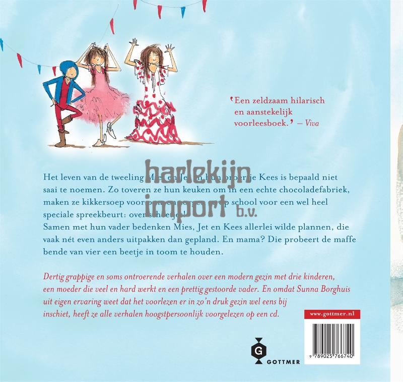 Een lekker dik boek over de bende van vier: tweeling Mies en Jet, hun jongere broertje Kees en hun gekke vader.