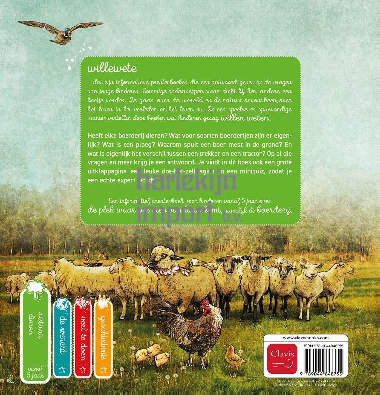 willewete … dat zijn informatieve prentenboeken die een antwoord geven op de vragen van jonge kinderen. Sommige onderwerpen staan dicht bij hen, andere een beetje verder. Ze gaan over de wereld en de natuur om ons heen, over het leven in het verleden en het leven nu. Op een speelse en spitsvondige manier vertellen deze boeken wat kinderen graag willen weten. Wat voor soorten boerderijen zijn er eigenlijk? Heeft elke boerderij dieren? Wat is een ploeg? Waarom spuit een boer mest in de grond? En wat is eigenlijk het verschil tussen een trekker en een tractor? Op al die vragen en meer krijg je een antwoord. Je vindt in dit boek ook een grote uitklappagina, een leuke knutselbladzijde en een miniquiz, zodat je een echte expert wordt. Een informatief prentenboek voor kinderen vanaf 5 jaar over een de plek waar ons eten vandaan komt, namelijk de boerderij.