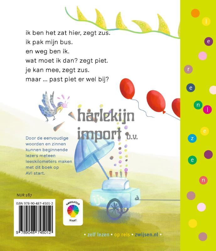 Zus gaat op reis met haar bus. Past Piet er wel bij in de volle bus? En wie komen ze onderweg nog meer tegen? Grappig verhaal over een gezellige reis op AVI Start. Iedere beginnende lezer in groep 3/leerjaar 1 wil laten zien hoe goed hij al kan lezen. Hoe leuk is het om dat te laten zien met dit herkenbare verhaal vol korte woorden en eenvoudige zinnen? Dat is nog eens leuk leeskilometers maken.