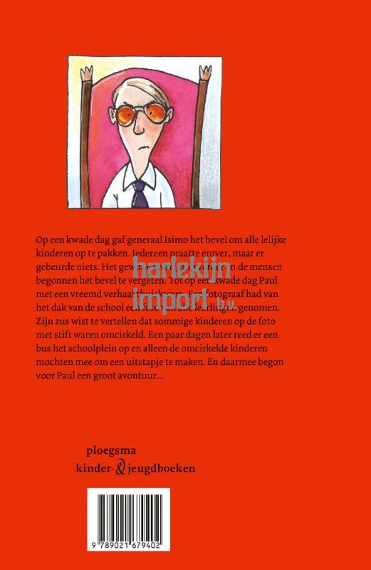 Op een kwade dag gaf generaal Isimo het bevel om alle lelijke kinderen op te pakken. Iedereen praatte erover, maar er gebeurde niets. Het gewone leven ging verder en de mensen begonnen het bevel te vergeten. Tot op een kwade dag Paul met een vreemd verhaal thuiskwam. Een fotograaf had van het dak van de school een foto van alle leerlingen genomen. Zijn zus wist te vertellen dat een aantal kinderen op de foto met stift waren omcirkeld. Een paar dagen later reed er een bus het schoolplein op en alleen de omcirkelde kinderen mochten mee om een uitstapje te maken. En daarmee begon voor Paul een groot avontuur... Met extra info over de bioscoopfilm.