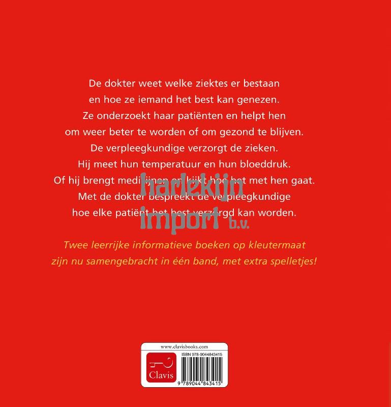 De dokter weet welke ziektes er bestaan en hoe ze iemand het best kan genezen. Ze onderzoekt haar patiënten en helpt hen om weer beter te worden of om gezond te blijven. De verpleegkundige verzorgt de zieken. Hij meet hun temperatuur en hun bloeddruk. Of hij brengt medicijnen en kijkt hoe het met hen gaat. Met de dokter bespreekt de verpleegkundige hoe elke patiënt het best verzorgd kan worden. Twee leerrijke informatieve boeken op kleutermaat zijn nu samengebracht in één band, met extra spelletjes!