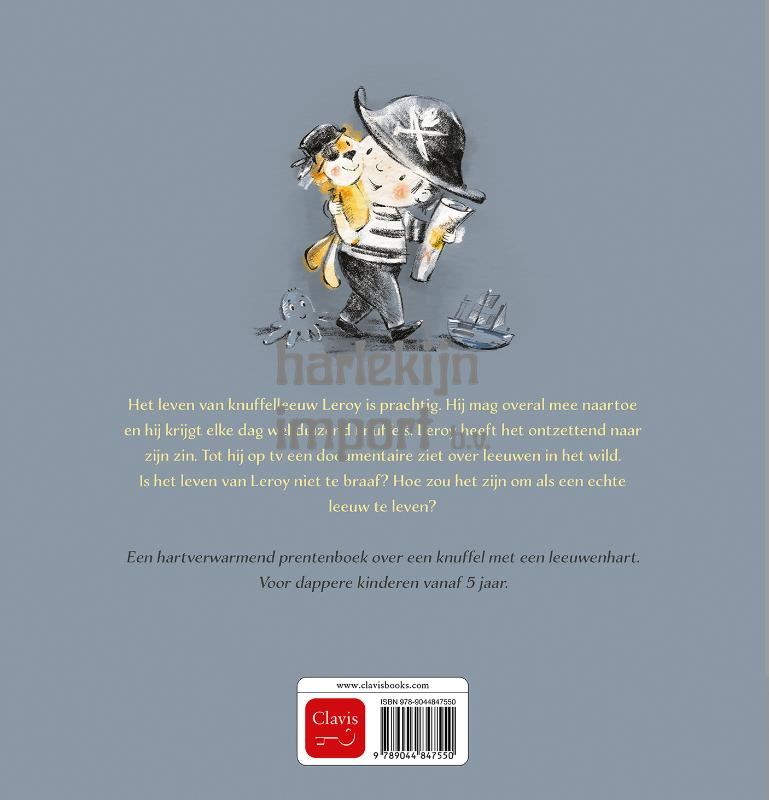 Het leven van knuffelleeuw Leroy is prachtig. Hij mag overal mee naartoe en hij krijgt elke dag wel duizend knuffels. Leroy heeft het ontzettend naar zijn zin. Tot hij op tv een documentaire ziet over leeuwen in het wild. Is het leven van Leroy niet te braaf? Hoe zou het zijn om als een echte leeuw te leven? Een hartverwarmend prentenboek over een knuffel met een leeuwenhart. Voor dappere kinderen vanaf 5 jaar.