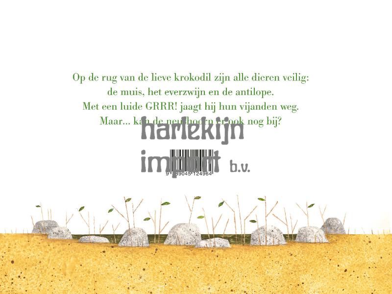 Op deze krokodil kan je rekenen. Iedereen kan op zijn lange rug terecht: de muis, het everzwijn, de antilope. Met zijn grote bek vol scherpe tanden houdt de lieve krokodil vijanden op een afstand. Wie jaagt op zijn vrienden krijgt een lesje. GRRRRR! Maar is er ook nog plaats voor… een bange neushoorn?