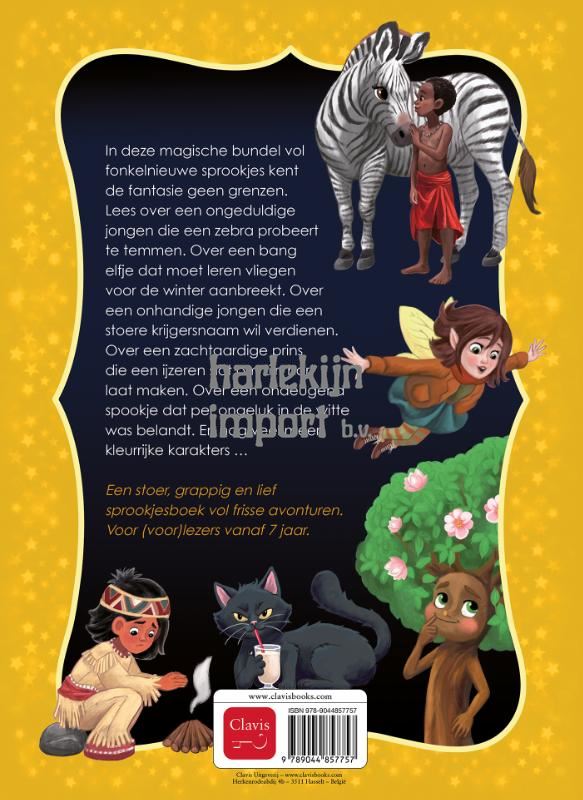 In deze magische bundel vol fonkelnieuwe sprookjes kent de fantasie geen grenzen. Lees over een ongeduldige jongen die een zebra probeert te temmen. Over een bang elfje dat moet leren vliegen voor de winter aanbreekt. Over een onhandige jongen die een stoere krijgersnaam wil verdienen. Over een zachtaardige prins die een ijzeren slot om zijn hart laat maken. Over een ondeugend spookje dat per ongeluk in de witte was belandt. En nog veel meer kleurrijke karakters … Een stoer, grappig en lief sprookjesboek vol frisse avonturen. Voor (voor)lezers vanaf 7 jaar.