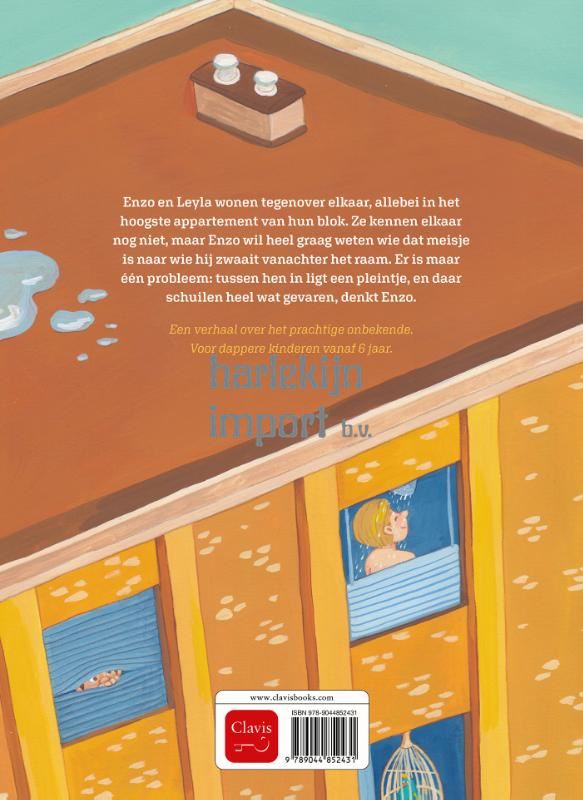 Enzo en Leya wonen tegenover elkaar, allebei in het hoogste appartement van hun blok. Ze kennen elkaar nog niet, maar Enzo wil heel graag weten wie dat meisje is naar wie hij zwaait vanachter het raam. Er is maar één probleem: tussen hen in ligt een pleintje, en daar schuilen heel wat gevaren, denkt Enzo. Een verhaal over het prachtige onbekende. Voor dappere kinderen vanaf 6 jaar.