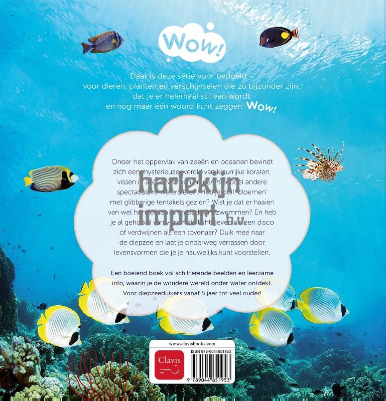 Daar is deze serie voor bedoeld – voor dieren, planten en verschijnselen die zo bijzonder zijn, dat je er helemaal stil van wordt en nog maar één woord kunt zeggen: Wow! Onder het oppervlak van zeeën en oceanen bevindt zich een mysterieuze wereld van kleurrijke koralen, vissen in allerlei vormen en een heleboel andere spectaculaire waterdieren. Heb je ooit bloemen met glibberige tentakels gezien? Wist je dat er haaien van wel honderden jaar oud rondzwemmen? En heb je al gehoord van vissen die licht geven als een disco of verdwijnen als een tovenaar? Duik mee naar de diepzee en laat je onderweg verrassen door levensvormen die je je nauwelijks kunt voorstellen. Een boeiend boek vol schitterende beelden en leerzame info, waarin je de wondere wereld onder water ontdekt. Voor diepzeeduikers vanaf 5 jaar tot veel ouder!