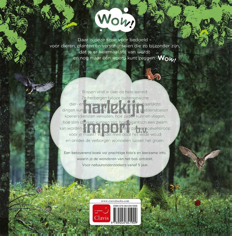 Een betoverend boek vol prachtige foto’s en leerzame info, waarin je de wonderen van het bos ontdekt. Voor natuuronderzoekers vanaf 5 jaar. Bossen vind je over de hele wereld. Ze herbergen talloze buitengewone dier- en plantensoorten, die de wonderbaarlijkste dingen kunnen. Weet je bijvoorbeeld hoe paddenstoelen koeriersdiensten vervullen, hoe zaden kunnen vliegen, hoe slim struiken kunnen zijn, hoe gigantisch een zwam kan worden of hoe een boom lekkere pannenkoekensiroop voor je maakt? Wandel mee door het wilde woud en ontdek de verborgen wonderen tussen het groen. Wow! Daar is deze serie voor bedoeld – voor dieren, planten en verschijnselen die zo bijzonder zijn, dat je er helemaal stil van wordt en nog maar één woord kunt zeggen: wow!