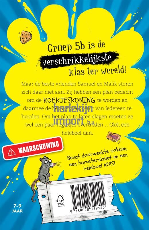 Groep 5B is de verschrikkelijkste klas van de wereld! Maar beste vrienden Samuel en Malik maken zich daar geen moment druk om. Ze hebben een geweldig plan bedacht om de Koekjeskoningen van de school te worden, en iedereen versteld te doen staan. Het plan betekent alleen wel dat ze een HELEBOEL regels moeten overtreden… Boordevol zompige schoenen, een hamsterskelet en heel veel viezigheid! Joanna Nadin is een awardwinnende auteur van meer dan tachtig kinderboeken. Ze was ook ooit jongleur, strandwacht en adviseur van de minister-president. Joanna woont in Bath, en haar favoriete dingen zijn geiten, apen en chips.