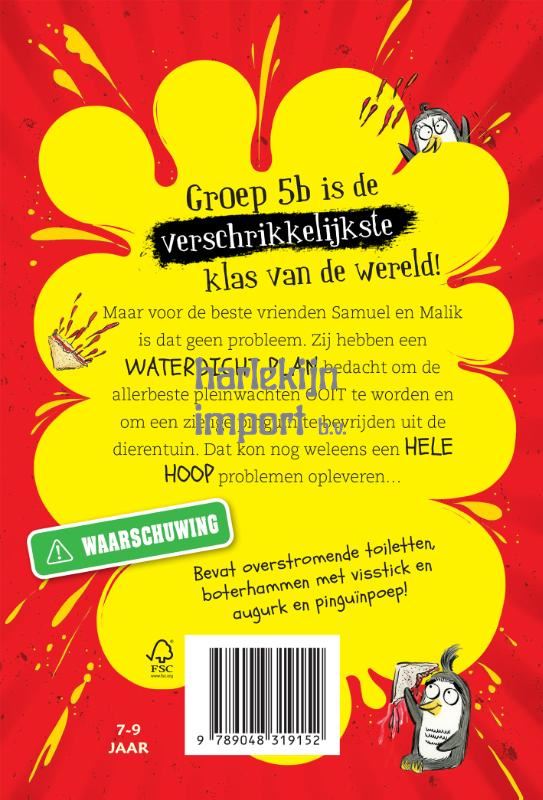 Volgens het schoolhoofd is groep 5B letterlijk de verschrikkelijkste klas van de wereld! Ze zegt dat school niet draait om gek doen, grapjes en plezier. School is om te leren en het wordt hoog tijd dat de kinderen in 5B hun best gaan doen om te excelleren. Maar Sam en Malik wilden niet létterlijk de wc’s laten overstromen toen ze het schoolplein in de gaten moesten houden. En het was zéker niet hun bedoeling om een pinguïn mee naar huis te nemen na het schoolreisje naar de dierentuin. Zulke dingen gebeuren gewoon, zelfs wanneer ze een plan bedenken dat gewoon niet kán mislukken… Joanna Nadin is een awardwinnende auteur van meer dan tachtig kinderboeken. Ze was ook ooit jongleur, strandwacht en adviseur van de minister-president. Joanna woont in Bath, en haar favoriete dingen zijn geiten, apen en chips.
