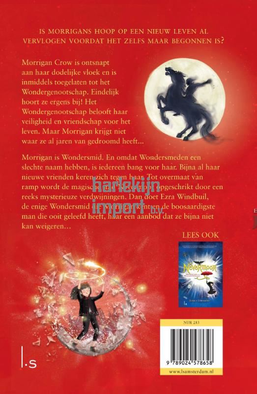 Na Nevermoor 1 – Morrigan Crow en het Wondergenootschap van Jessica Townsend is er nu het superspannende vervolg: Wondersmid – De roeping van Morrigan Crow. Morrigan Crow is ontsnapt aan haar dodelijke vloek en is inmiddels toegelaten tot het Wondergenootschap. Eindelijk hoort ze ergens bij! Het Wondergenootschap belooft haar veiligheid en vriendschap voor het leven. Maar Morrigan krijgt niet waar ze al jaren van gedroomd heeft... Morrigan is Wondersmid. En omdat Wondersmeden een slechte naam hebben, is iedereen bang voor haar. Bijna al haar nieuwe vrienden keren zich tegen haar. Tot overmaat van ramp wordt de magische stad Nevermoor opgeschrikt door een reeks mysterieuze verdwijningen. Dan doet Ezra Windbuil, de enige Wondersmid die Morrigan kent en de boosaardigste man die ooit geleefd heeft, haar een aanbod dat ze bijna niet kan weigeren… Is haar hoop op een nieuw leven al vervlogen voordat het zelfs maar begonnen is? Over Nevermoor: ‘Nevermoor is een fantastisch oord, en verdient een eigen plekje naast Zweinstein.’ Jaapleest.nl ‘Een heerlijk avontuur voor sterke lezers, om helemaal in te verdwijnen.’ Trouw ‘Vooral de vaart en de humor maken dat Townsends debuut Nevermoor nieuwsgierig maakt naar meer.’ **** NRC Handelsblad