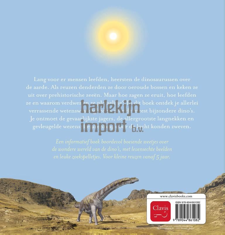 Lang voor er mensen leefden, heersten de dinosaurussen over de aarde. Als reuzen denderden ze door oeroude bossen en keken ze uit over prehistorische zeeën. Maar hoe zagen ze eruit, hoe leefden ze en waarom verdwenen ze plotseling? In dit boek ontdek je allerlei verrassende wetenswaardigheden over de meest bijzondere dino’s. Je ontmoet de gevaarlijkste jagers, de allergrootste langnekken en gevleugelde wezens die urenlang door de lucht konden zweven. Een informatief boek boordevol boeiende weetjes over de wondere wereld van de dino’s, met levensechte beelden en leuke zoekspelletjes. Voor kleine reuzen vanaf 5 jaar.