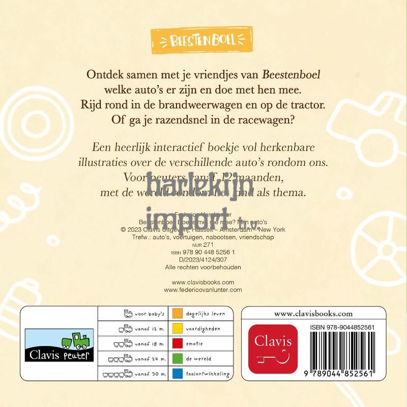 Ontdek samen met je vriendjes van Beestenboel welke auto’s er zijn en doe met hen mee. Rijd rond in de brandweerwagen en op de tractor. Of ga je razendsnel in de racewagen? Een heerlijk interactief boekje vol herkenbare illustraties over de verschillende auto’s rondom ons. Voor peuters vanaf 12 maanden, met de wereld rondom het kind als thema.