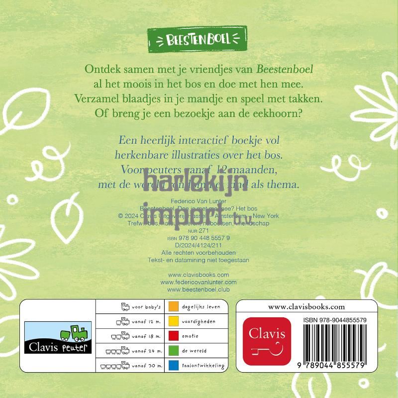Ontdek samen met je vriendjes van Beestenboel al het moois in het bos en doe met hen mee. Verzamel blaadjes in je mandje en speel met takken. Of breng je een bezoekje aan de spin, de vogel en de eekhoorn? Een heerlijk interactief boekje vol herkenbare illustraties over het bos. Voor peuters vanaf 12 maanden, met de wereld rondom het kind als thema.