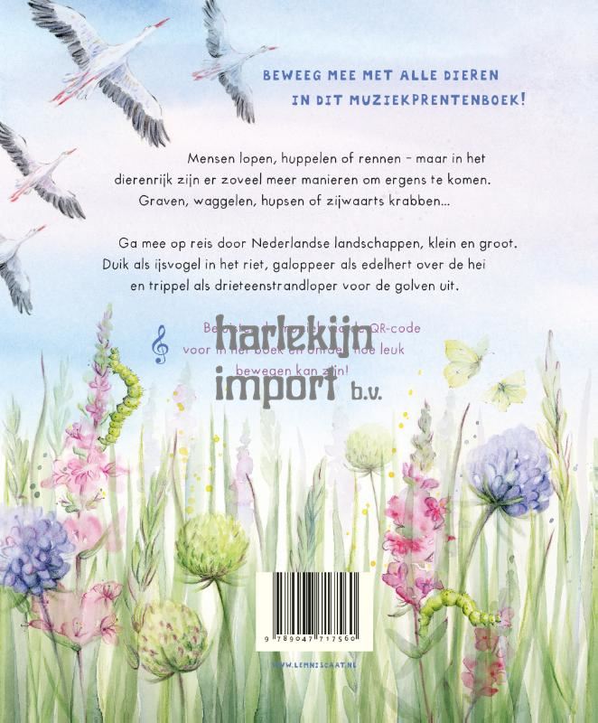 <p>Mensen lopen, huppelen of rennen – maar in het dierenrijk zijn er zoveel meer manieren om ergens te komen. Graven, waggelen, hupsen of zijwaarts krabben… De meest wonderlijke bewegingen komen voorbij in dit boek. Doe mee met alle dieren en ontdek hoe leuk bewegen kan zijn!</p><p>Anne-Lieke Faber neemt je met schitterende waterverfillustraties en versjes mee op reis door Nederlandse landschappen, klein en groot. Duik als ijsvogel in het riet, galoppeer als edelhert over de heidevelden en trippel als drieteenstrandloper voor de golven uit.</p><p>Bij alle twaalf dieren heeft componist Alexander Reumers betoverend mooie muziek gecomponeerd. Klik op de link hieronder om het album op Spotify te beluisteren.</p>