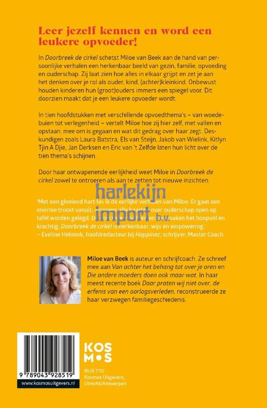Doorbreek de cirkel en word een leukere opvoeder. Aan de hand van zeer persoonlijke verhalen schetst auteur Miloe van Beek een eerlijk en herkenbaar beeld van gezin, familie, opvoeding en ouderschap. Ze laat zien hoe patronen van generatie op generatie worden doorgegeven, in elkaar grijpen én wat er kan gebeuren als je in de spiegel durft te kijken die je kind je voorhoudt. Veel ouders herhalen tijdens de opvoeding onbewust wat ze zelf als kind hebben gezien en ervaren. Groeide je op zonder aandacht voor je binnenwereld? Mocht je niet boos zijn? Leerde je niet hoe je met je emoties om moest gaan? Dan loop je kans om hier tegenaan te lopen in de opvoeding van je eigen kinderen. Zij zullen je een spiegel voorhouden en je raken op precies die plekken die pijnlijk zijn. Meer kennis over je familiesysteem is enorm helpend, stelt Miloe van Beek in ‘Doorbreek de cirkel’. Zonder vingerwijzen of schuldvraag maakt ze inzichtelijk hoe je verleden jou als ouder heeft gevormd en geeft je handvatten om het anders te doen. Dit boek vraagt je om naar binnen te kijken in plaats van naar buiten. Behalve persoonlijke ervaringen, lees je in ‘Doorbreek de cirkel’ ook de visie van deskundigen zoals familieopsteller Els van Stijn (bekend van bestseller ‘De Fontein’), orthopedagoog Laura Batstra, Dreamschool rector Eric van ’t Zelfde en leiderschapsexpert en partner De School voor Transitie Jakob van Wielink. Zij laten zien hoe ouders om kunnen gaan met lastige opvoedsituaties en wat ze ervan kunnen leren. Durf jij in de spiegel te kijken? Wil je meer weten over dit onderwerp? Beluister dan nu ook de Podcast 'Doorbreek de cirkel'.