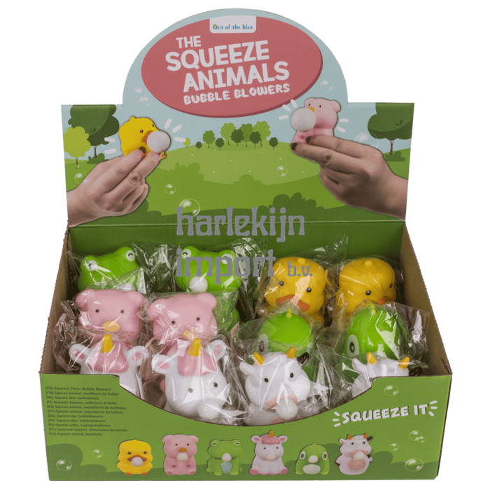 Dsp. Knijp dieren, bellenblaasjesblazers. 6 cm. 6 assortie. 12 stuks in display. |