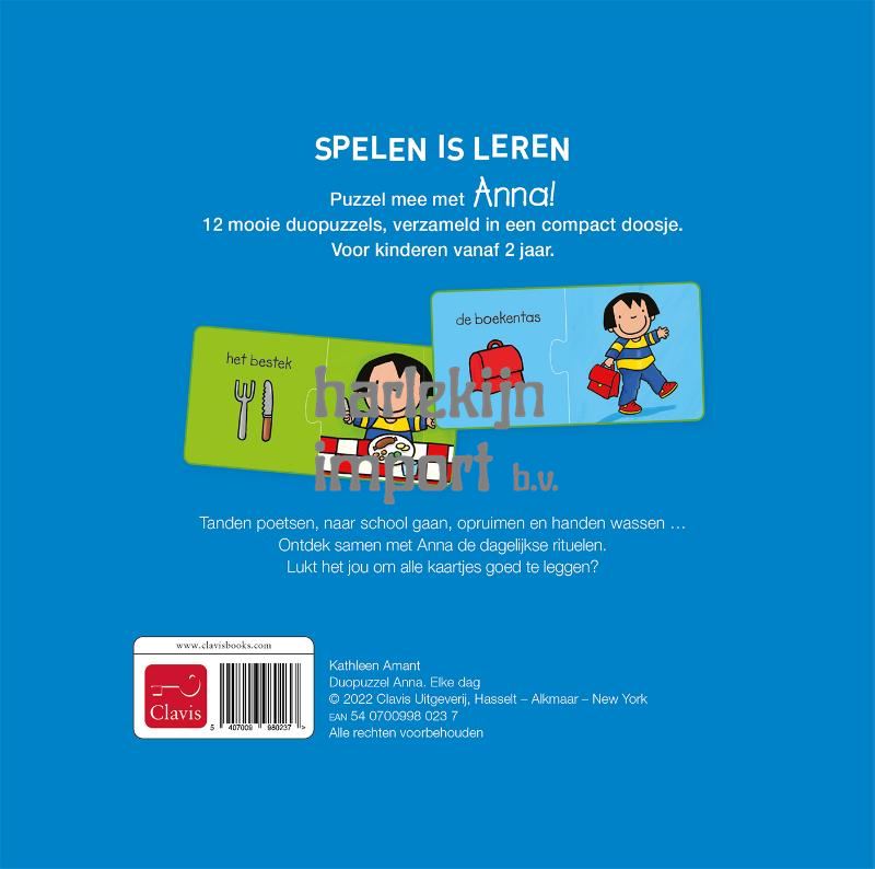 Puzzel mee met Anna! 12 mooie duopuzzels, verzameld in een compact doosje. Voor kinderen vanaf 2 jaar. Tanden poetsen, naar school gaan, opruimen en handen wassen … Ontdek samen met Anna de dagelijkse rituelen. Lukt het jou om alle kaartjes goed te leggen?