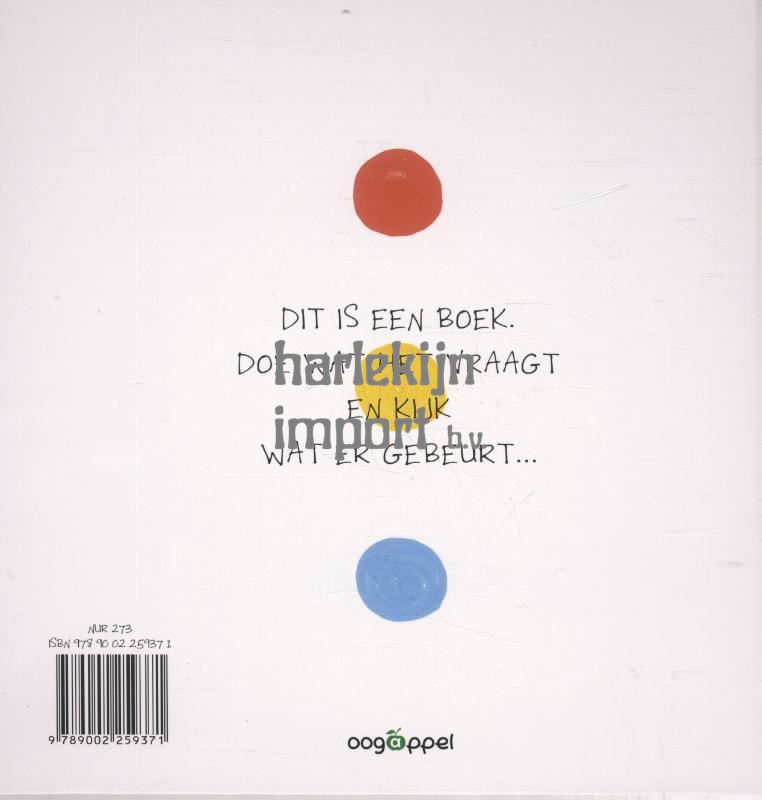 Door op een geel bolletje te duwen, te tikken of te wrijven, ermee te schudden, in je handen te klappen, te blazen of het boek scheef te houden verandert het gele bolletje op de volgende bladzijde in aantal, kleur, grootte of ordening. De bolletjes zijn geschilderd met gele, rode en blauwe verf op een witte achtergrond; op een aantal pagina's is die (als gevolg van een opdracht op de voorgaande pagina) geheel of gedeeltelijk zwart. Wanneer de bolletjes elkaar overlappen, ontstaat een mengkleur. De teksten zien eruit alsof ze handmatig in hoofdletters geschreven zijn. Ze spreken de lezer direct aan en bestaan uit opdrachten om het beeld op de volgende bladzijde te veranderen. Een origineel en erg leuk boek waarbij jonge kinderen aangesproken worden om actief mee te doen. Vanaf ca. 4 jaar.