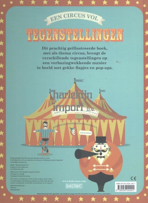 Dit prachtig geïllustreerde boek, met als thema circus, brengt de verschillende tegenstellingen op een verbazingwekkende manier in beeld met gekke flapjes en pop-ups. Thema: circus, Flapjesboek in retrostijl, tegenstellingen.