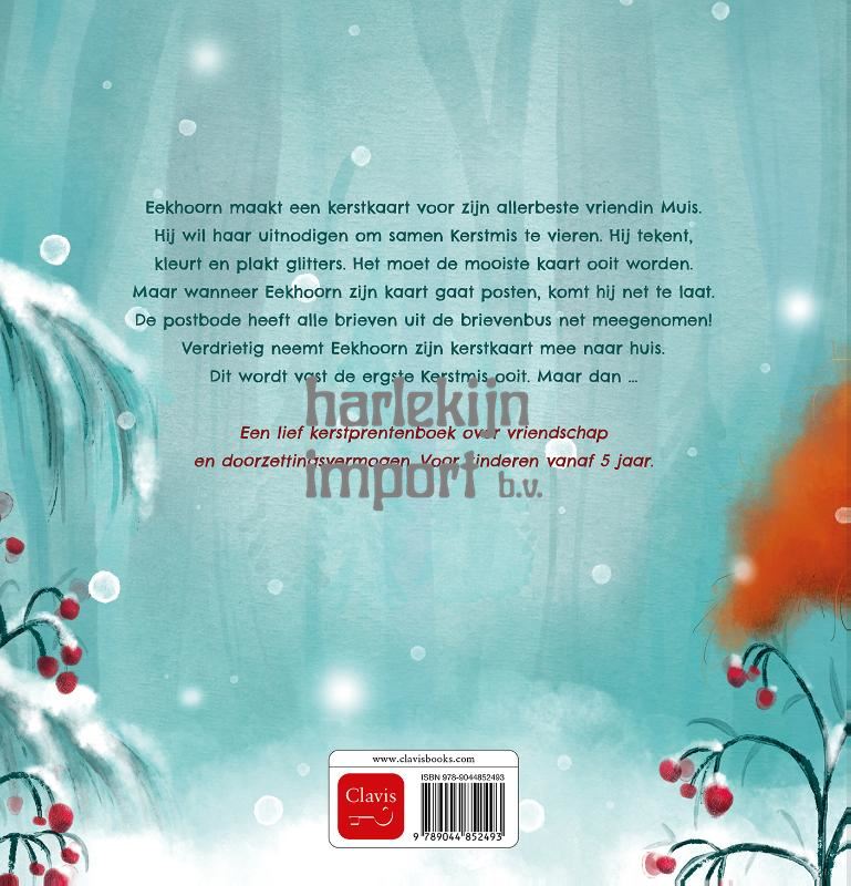 Eekhoorn maakt een kerstkaart voor zijn allerbeste vriendin Muis. Hij wil haar uitnodigen om samen Kerstmis te vieren. Hij tekent, kleurt en plakt glinsters. Het moet de mooiste kaart ooit worden. Maar wanneer Eekhoorn zijn kaart gaat posten, komt hij net te laat. De postbode heeft alle brieven uit de brievenbus net meegenomen! Verdrietig neemt Eekhoorn zijn kerstkaart mee naar huis. Dit wordt vast de ergste Kerstmis ooit. Maar dan … Een lief kerstprentenboek over vriendschap en doorzettingsvermogen. Voor kinderen vanaf 5 jaar.