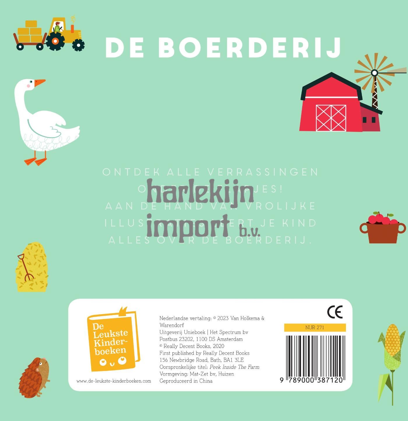 Kom je kijken op de boerderij?Hoor je de paarden hinniken? Zie je de wortels en spruitjes in het veld? We zijn op de boerderij! Kijk achter de flapjes en ontdek welke dieren in de stallen wonen, welke groentes er op de akker staan, en wie er in het meertje rondzwemmen. Zo leer je meer dan honderd boerderijwoorden!Een kijkje op de boerderij is een kleurrijk kartonboek met afgeronde hoeken en stevige flappen, zodat peuters en kleuters alles over de boerderij kunnen ontdekken. De perfecte combinatie van spelen en leren voor kinderen vanaf 18 maanden. Met stevige kartonpagina’s die geschikt zijn voor kleine handjes.