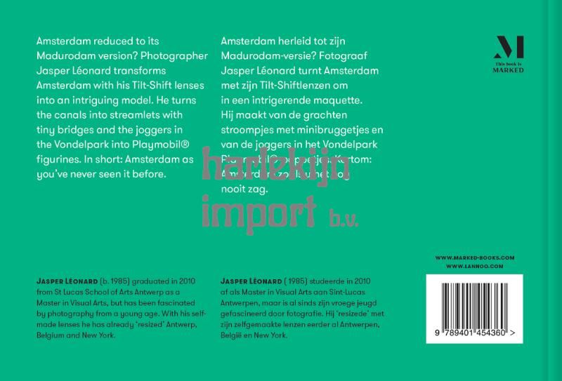 Amsterdam herleid tot zijn Madurodam-versie? Fotograaf Jasper Léonard turnt Amsterdam met zijn Tilt-Shiftlenzen om in een intrigerende maquette. Hij maakt van de grachten stroompjes met minibruggetjes en van de joggers in het Vondelpark Playmobil®-poppetjes. Kortom: Amsterdam zoals u het nog nooit zag.