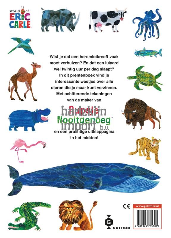 ‘Eric Carle’s grote dierenboek’ is een prachtig geïllustreerd en groot, dik prentenboek vol dieren. Van walvissen en paarden tot minder bekende dieren als de rode wolf, elk dier komt prachtig tot leven in de stijl die we van Eric Carle zo gewend zijn. Bovendien zijn de dieren voorzien van interessante, onverwachte en leuke weetjes. Eric Carle kon niet alleen rupsen geweldig weergeven; dit boek laat zien dat in zijn handen ook bosdieren, savannedieren, zeedieren en boerderijdieren in ware kunstwerkjes veranderden. Wist je dat een heremietkreeft vaak moet verhuizen? En dat een luiaard wel twintig uur per dag slaapt? ‘Eric Carle’s grote dierenboek’ is een dik prentenboek met prachtige tekeningen en interessante weetjes over alle dieren die je maar kunt verzinnen, van een grote favoriet als de olifant tot de kleine bosmuis.