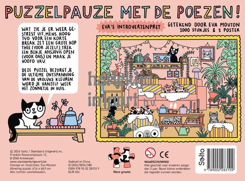 Het eerste hebbeding van Eva's introvertenpret is een feit: een poezenpuzzel met maar liefst 1000 stukjes. We laten een van de poezen aan het woord:Wat zie je er weer gestrest uit, mens. Hoog tijd voor een korte break.Zet een grote kop thee (voor jezelf), trek een blikje ansjovis open (voor ons)en maak je hoofd vrij. Deze puzzel bezorgt je de ultieme ontspanning. Van de vrolijke kleuren word je vanzelf weer het zonnetje in huis.
